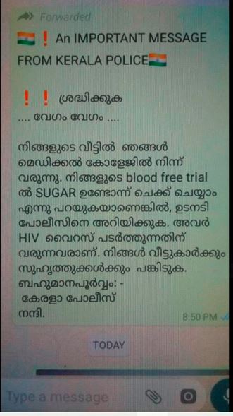 ”നിങ്ങളുടെ വീട്ടിൽ ഞങ്ങൾ മെഡിക്കൽ കോളേജിൽ നിന്ന് വരുന്നു. നിങ്ങളുടെ blood free trial ൽ SUGAR ഉണ്ടോന്ന് ചെക്ക് ചെയ്യാം എന്നു പറയുകയാണെങ്കിൽ, ഉടനടി പോലീസിനെ അറിയിക്കുക. അവർ HIV വൈറസ് പടർത്തുന്നതിന് വരുന്നവരാണ്. നിങ്ങൾ വീട്ടുകാർക്കും സുഹൃത്തുക്കൾക്കും പങ്കിടുക,” എന്നാണ് ആ സന്ദേശത്തിന്റെ ഉള്ളടക്കം.
