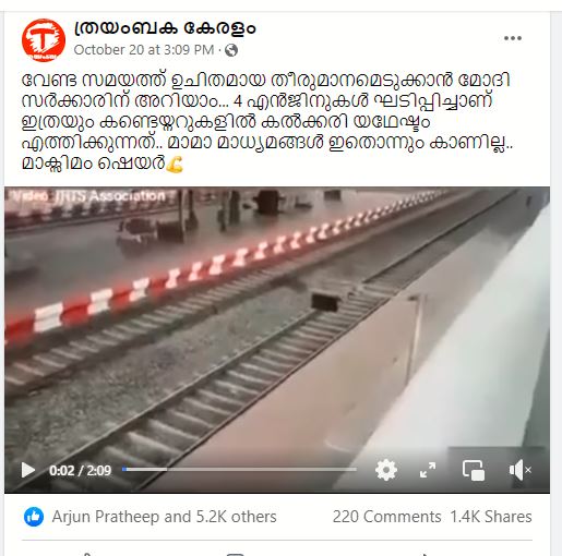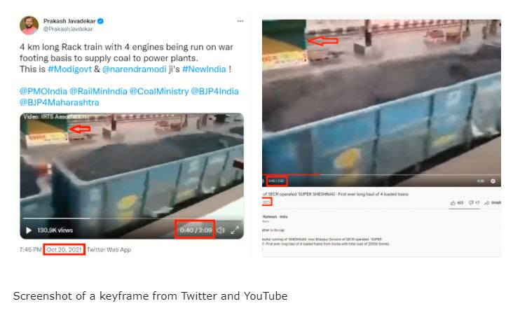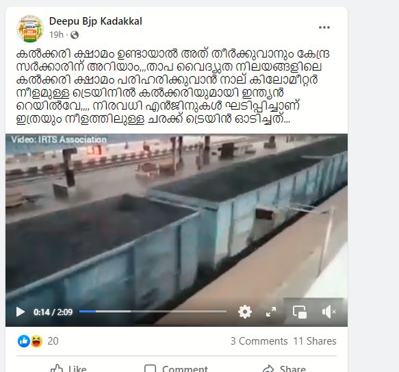 2021 ജനുവരിയിലെ ചരക്ക് ട്രെയിനിന്റെ ഒരു പഴയ വീഡിയോ, കൽക്കരി പ്രതിസന്ധിയുടെ പശ്ചാത്തലത്തിൽ പ്രകാശ് ജാവദേക്കർ സമീപകാല വീഡിയോ എന്ന പേരിൽ തെറ്റായി പങ്കിട്ടു. ഈ ട്വീറ്റിനെ അടിസ്ഥാനമാക്കിയാണ് ചിലർ മലയാളത്തിൽ ഫേസ്ബുക്കിൽ പോസ്റ്റുകളിട്ടത്.