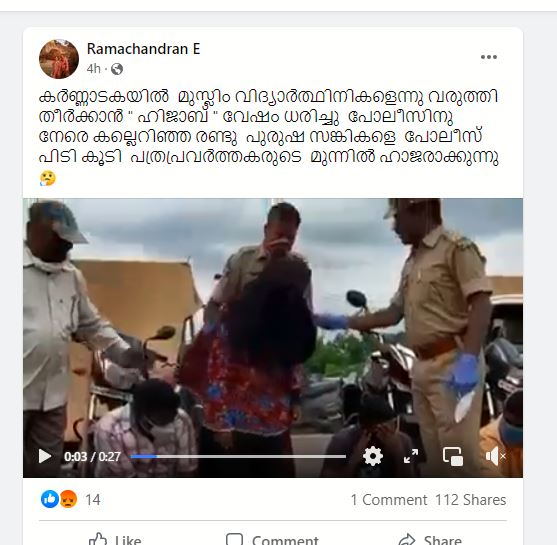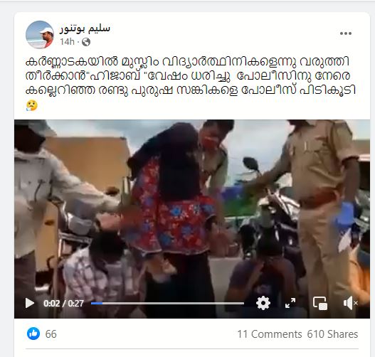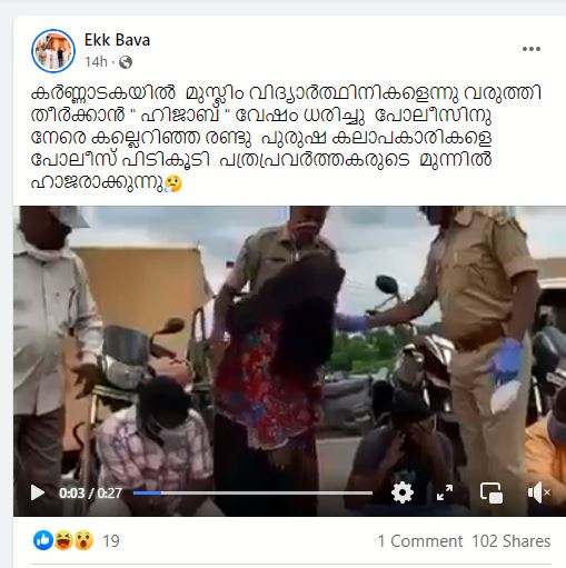 “പോലീസ് പിടികൂടിയ, ഹിജാബ് ധരിച്ചു പോലീസിനു നേരെ കല്ലെറിഞ്ഞ പുരുഷ കലാപകാരിയുടേത്” എന്ന് അവകാശപ്പെടുന്ന ഒരു വീഡിയോ ഹിജാബ് വിവാദങ്ങൾക്കിടയിൽ ഫേസ്ബുക്കിൽ വൈറലാകുന്നുണ്ട്. “കർണ്ണാടകയിൽ മുസ്ലിം വിദ്യാർത്ഥിനികളെന്നു വരുത്തി തീർക്കാൻ ” ഹിജാബ് ” വേഷം ധരിച്ചു പോലീസിനു നേരെ കല്ലെറിഞ്ഞ രണ്ടു പുരുഷ കലാപകാരികളെ പോലീസ് പിടികൂടി പത്രപ്രവർത്തകരുടെ മുന്നിൽ ഹാജരാക്കുന്നു.” എന്ന വിവരണത്തോടെയാണ് വീഡിയോ ഷെയർ ചെയ്യപ്പെടുന്നത്.