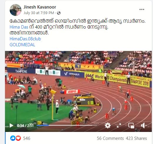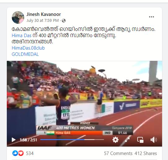 ”കോമൺവെൽത്ത് ഗെയിംസിൽ ഇന്ത്യക്ക് ആദ്യ സ്വർണം. ഹിമ ദാസ് 400 മീറ്ററിൽ സ്വർണം നേടുന്നു.അഭിനന്ദനങ്ങൾ.” ഫേസ്ബുക്കിൽ വൈറലാവുന്ന ഒരു വീഡിയോയുടെ കൂടെയുള്ള വിവരണത്തിൽ വരികളാണ് ഇത്.