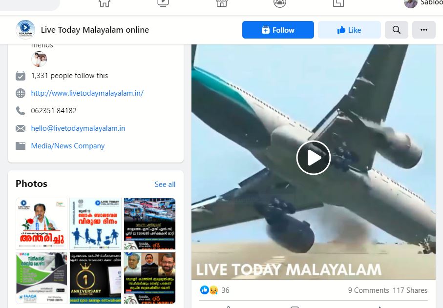 Live Today Malayalam online എന്ന ഐഡിയിൽ നിന്നുള്ള വീഡിയോ ഞങ്ങൾ കണ്ടപ്പോൾ അതിന് 119 ഷെയറുകൾ ഉണ്ടായിരുന്നു. Indonesian വിമാനം ഖോമിനും ടെഹ്റാനും ഇടയിൽ പ്രശ്നത്തെ തുടർന്ന് ഇഷ്ഫാനിൽ അടിയന്തര ലാൻഡിംഗ് നടത്തേണ്ടി വന്നുവെന്നാണ് പോസ്റ്റ് അവകാശപ്പെടുന്നത്.