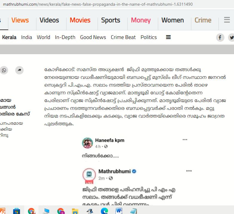 മാതൃഭൂമിയുടെ പേരില് വ്യാജ പ്രചാരണം നടത്തുന്നവര്ക്കെതിരെ ബന്ധപ്പെട്ടവര്ക്ക് പരാതി നല്കും. മറ്റു നിയമ നടപടികളിലേക്കും കടക്കും. വ്യാജ വാര്ത്തയ്ക്കെതിരെ സമൂഹം ജാഗ്രത പുലര്ത്തുക. സമസ്ത അധ്യക്ഷന് ജിഫ്രി മുത്തുക്കോയ തങ്ങള്ക്കു നേരെയുണ്ടായ വധഭീഷണിയുമായി ബന്ധപ്പെട്ട് മുസ്ലിം ലീഗ് സംസ്ഥാന ജനറൽ സെക്രട്ടറി പി എം എ സലാം നടത്തിയ പ്രസ്താവനയെന്ന പേരില് താഴെ കാണുന്ന സ്ക്രീന്ഷോട്ട് വ്യാജമാണ്,” മാതൃഭൂമി വെബ്സൈറ്റിലെ വാർത്ത പറയുന്നു.