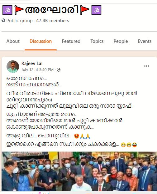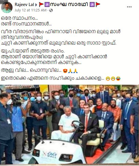 “ഒരേ സ്ഥാപനം. രണ്ട് സംസ്ഥാനങ്ങൾ. വീര വിരാടസിങ്കം ഫിണറായി വിജയനെ ലുലു മാൾ (തിരുവനന്തപുരം). ചുറ്റി കാണിക്കുന്നത് ലുലുവിലെ ഒരു സാദാ സ്റ്റാഫ്.യു.പി.യാണ് അടുത്ത രംഗം. ആരാണ് യോഗിജിയെ മാൾ ചുറ്റി കാണിക്കാൻ കൊണ്ടുപോകുന്നതെന്ന് കാണുക. ആളു വില. പൊന്നുവില.ഇതൊക്കെ എങ്ങനെ സഹിക്കും ചകാക്കളെ,”എന്ന് പിണറായി വിജയനെ കളിയാക്കിയാണ് പോസ്റ്റ്.