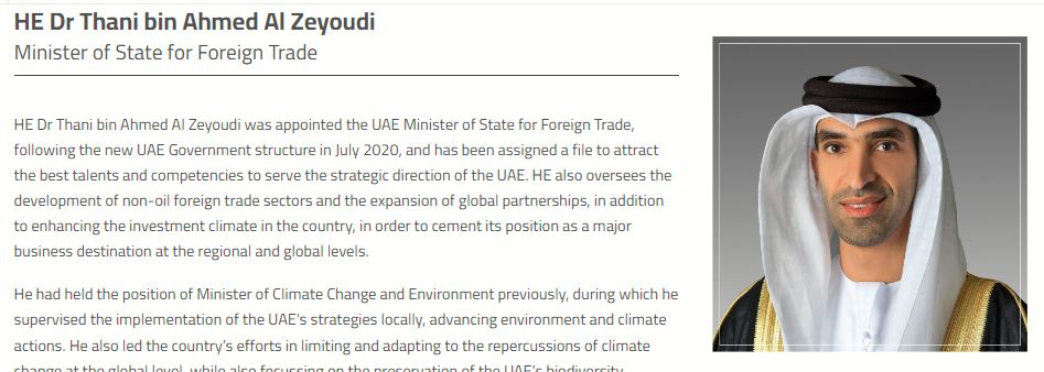 യുഎഇയുടെ സാമ്പത്തിക മന്ത്രാലയത്തിന്റെ വെബ്സൈറ്റ് പ്രകാരം ഡോ താനി ബിൻ അഹമ്മദ് അൽ-സെയൗദി വിദേശ വ്യാപാര സഹമന്ത്രിയാണ്. “2020 ജൂലൈയിൽ നടന്ന യുഎഇ ഗവൺമെന്റ് പുനഃസംഘടനയിൽ ഡോ താനി ബിൻ അഹമ്മദ് അൽ സെയൂദി യുഎഇ വിദേശ വ്യാപാര സഹമന്ത്രിയായി നിയമിക്കപ്പെട്ടു,” എന്നാണ് .യുഎഇയുടെ സാമ്പത്തിക മന്ത്രാലയത്തിന്റെ വെബ്സൈറ്റ് പറയുന്നത്.