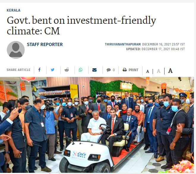 യുഎഇ വിദേശവ്യാപാര സഹമന്ത്രി താനി ബിൻ അഹമ്മദ് അൽ സെയൂദി, ഇന്ത്യയിലെ യുഎഇ അംബാസഡർ അഹമ്മദ് അബ്ദുൾറഹ്മാൻ അൽബന്ന, ലുലു ഗ്രൂപ്പ് ഇന്റർനാഷണൽ ചെയർമാനും മാനേജിങ് ഡയറക്ടറുമായ യൂസഫലി എം.എ, തുടങ്ങിയവർക്കൊപ്പം മുഖ്യമന്ത്രി പിണറായി വിജയൻ തിരുവനന്തപുരത്തെ ലുലു മാളിൽ ബഗ്ഗിയിൽ പര്യടനം നടത്തുന്നുവെന്നാണ് ചിത്രത്തിൻറെ കാപ്ഷൻ.