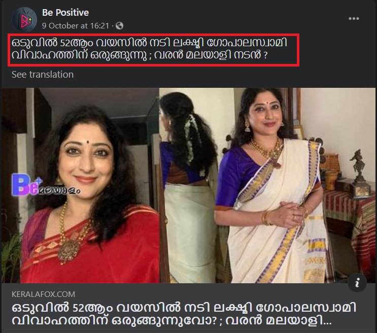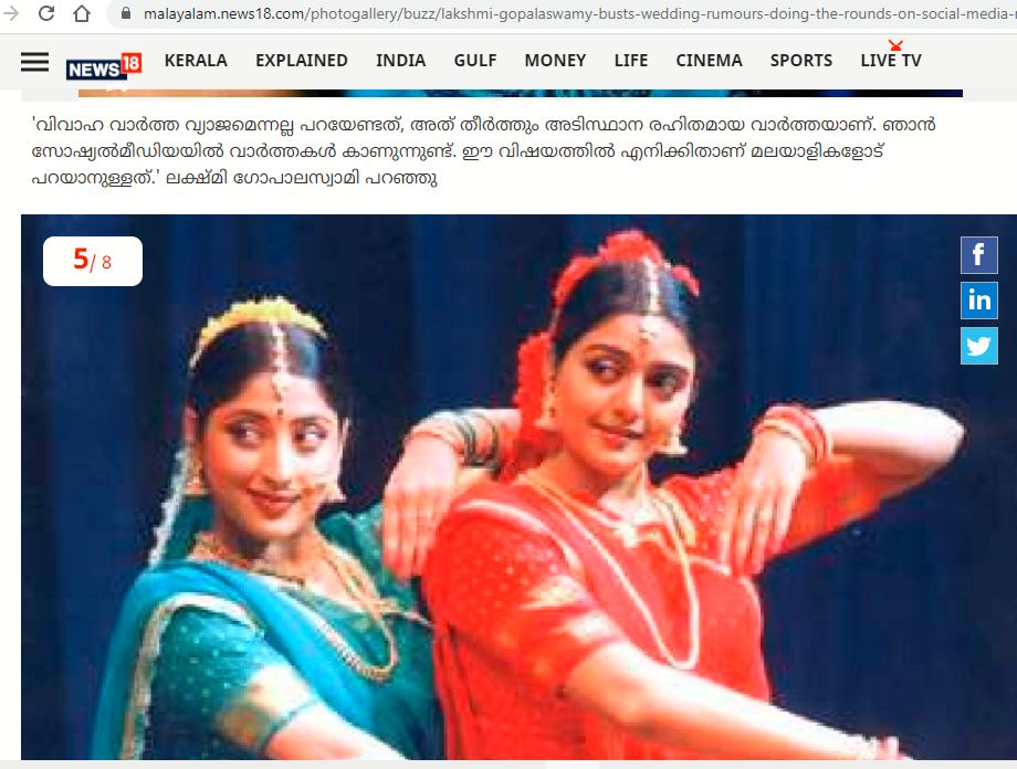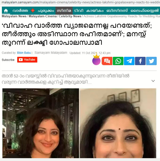 ഈ അടുത്ത ദിവസങ്ങളിൽ സോഷ്യൽ മീഡിയയിൽ സജീവ ചർച്ചയാവുന്ന ഒരു വിഷയം നടിയും നർത്തകിയുമായ ലക്ഷ്മി ഗോപാലസ്വാമിയുടെ വിവാഹമാണ്. അമ്പത്തിരണ്ടാം വയസ്സിൽ നടി വിവാഹിതയാവാൻ തീരുമാനിച്ചുവെന്നാണ് പ്രചരണം. ഈയിടെ വിവാഹമോചിതനായ നടൻ മുകേഷ് ലക്ഷ്മി ഗോപാലസ്വാമിയെ വിവാഹം കഴിക്കുമെന്ന തരത്തിൽ പ്രചാരണമുണ്ടായി. മുകേഷിനെ കൂടാതെ ഇടവേള ബാബുവിന്റെ പേരും വരന്റെ സ്ഥാനത്ത് ചിലർ പ്രചരിപ്പിക്കുന്നുണ്ട്.