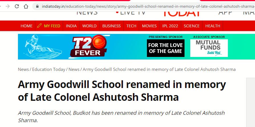 “ബഡ്കോട്ടിലെ ആർമി ഗുഡ്വിൽ സ്കൂളിൽ സംഘടിപ്പിച്ച ചടങ്ങിൽ, അന്തരിച്ച കേണൽ അശുതോഷ് ശർമ്മയുടെ സ്മരണാർത്ഥം സ്കൂളിന് ‘അശുതോഷ് ആർമി ഗുഡ്വിൽ സ്കൂൾ, ബുഡ്കോട്ട് എന്ന് പുനർനാമകരണം ചെയ്ത” വാർത്ത ഇന്ത്യ ടുഡേ 2021 ജൂണിൽ റിപ്പോർട്ട് ചെയ്തതും ഞങ്ങളുടെ ശ്രദ്ധയിൽ വന്നു.