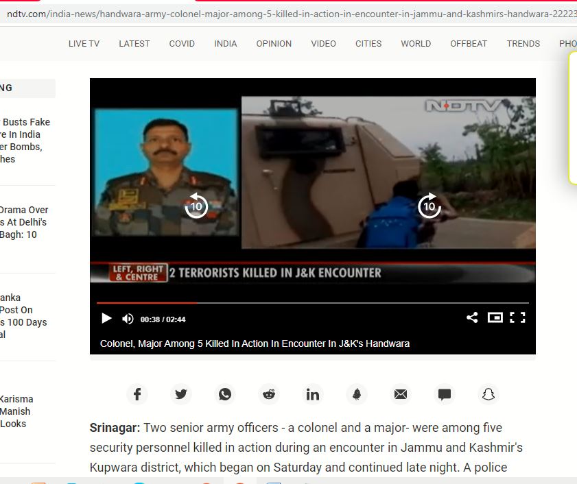 ഞങ്ങൾ ഫോട്ടോ റിവേഴ്സ് ഇമേജ് സേർച്ച് ചെയ്തു. അപ്പോൾ എൻഡിടിവി യിൽ നിന്നും ഈ പടം അടങ്ങുന്ന വിഷ്വൽ ഉള്ള ഒരു വീഡിയോ കിട്ടി. മേയ് 2020ലെ വാർത്തയായിരുന്ന അത്. കാശ്മീരിലെ ഹന്ദ്വാരയിൽ 2020 മെയ് മാസത്തിൽ ഭീകരരുമായി ഉണ്ടായ ഏറ്റുമുട്ടലിലാണ് അശുതോഷ് കൊല്ലപ്പെട്ടത് എന്ന് വാർത്തയിൽ നിന്നും വ്യക്തമായി.”ജമ്മു കശ്മീരിലെ കുപ്വാര ജില്ലയിൽ ശനിയാഴ്ച ആരംഭിച്ച ഏറ്റുമുട്ടലിൽ കൊല്ലപ്പെട്ട അഞ്ച് സുരക്ഷാ ഉദ്യോഗസ്ഥരിൽ രണ്ട് മുതിർന്ന സൈനിക ഉദ്യോഗസ്ഥർ – ഒരു കേണലും ഒരു മേജറും ഉൾപ്പെടുന്നതായി,” എൻഡിടിവി വാർത്ത പറയുന്നു.