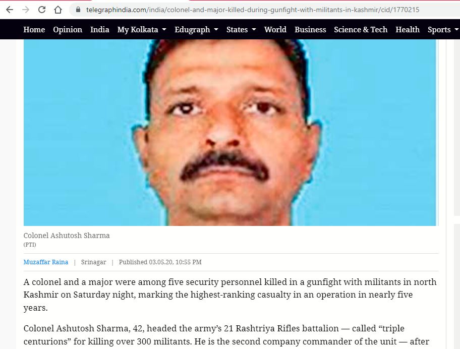 കേണൽ അശുതോഷ് ശർമ വീര മൃത്യു വരിച്ച വാർത്ത 2020ലേതാണ്