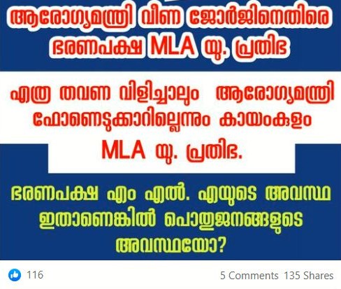 ആരോഗ്യമന്ത്രി വീണ ജോർജിനെതിരെ ഭരണപക്ഷ MLA യു. പ്രതിഭ എന്ന പേരിൽ ഒരു പോസ്റ്റ് വൈറലാവുന്നുണ്ട്. പോസ്റ്റിൽ ഇങ്ങനെ പറയുന്നു:“ എത്ര തവണ വിളിച്ചാലും ആരോഗ്യമന്ത്രി ഫോണെടുക്കാറില്ലെന്നും കായംകുളം എം. എൽ. എ. യു. പ്രതിഭ.ഭരണപക്ഷ എം എൽ. എയുടെ അവസ്ഥ ഇതാണെങ്കിൽ പൊതുജന അവസ്ഥയോ,”എന്നാണ് പോസ്റ്റ് പറയുന്നത്.