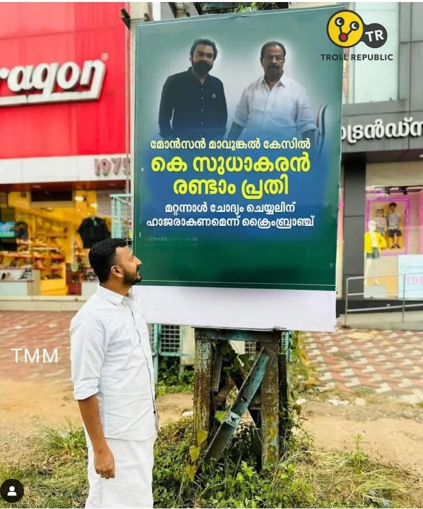തട്ടിപ്പു കേസിലെ പ്രതി മോൻസൺ മാവുങ്കലിനെതിരെയുള്ള പരാതിയിൽ കെപിസിസി പ്രസിഡന്റ് കെ സുധാകരൻ രണ്ടാം പ്രതിയാണെന്ന് പറയുന്ന ബാനർ യൂത്ത് ലീഗ് നേതാവ് പി കെ ഫിറോസ് മുറം കൊണ്ട് മറയ്ക്കുമ്പോൾ, യൂത്ത് കോൺഗ്രസ്സ് നേതാവ് രാഹുൽ മാങ്കുട്ടത്തിൽ നോക്കി നിൽക്കുന്നത് കാണിക്കുന്ന ഒരു ഫോട്ടോ.