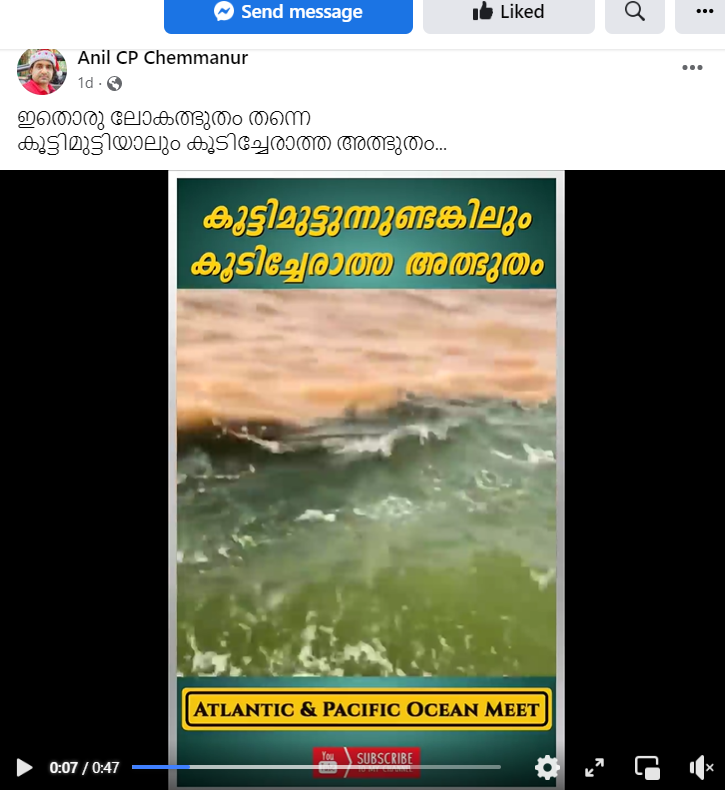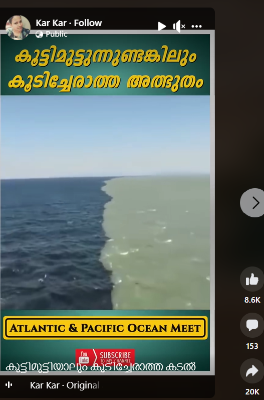 അറ്റ്ലാന്റിക് പസഫിക്ക് സമുദ്രങ്ങളുടെ സംഗമ സ്ഥാനത്തിന്റേത് എന്ന പേരിൽ ഒരു വിഡിയോ ഫേസ്ബുക്കിൽ പ്രചരിക്കുന്നുണ്ട്..കടൽവെള്ളം തമ്മിൽ കലരാതെ രണ്ടു നിറങ്ങളിലാണ് വീഡിയോയിൽ. Kar Kar എന്ന ഐഡിയിൽ നിന്നുള്ള റീൽസ് ഞങ്ങൾ കാണുമ്പോൾ അതിന് 20 k ഷെയറുകളും 8.6 k ലൈക്കുകളും ഉണ്ട്.