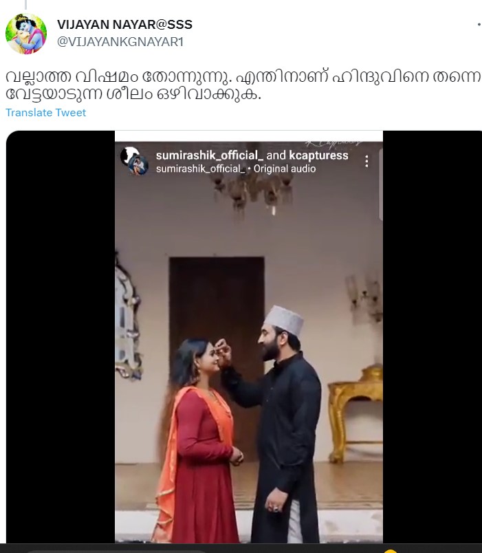 വൈറലായ വീഡിയോയുമായി ബന്ധപ്പെട്ടവർ പറഞ്ഞത് സൂഫിയും സുജാതയും എന്ന സിനിമയിലെ ഗാന രംഗം പുനഃസൃഷ്ടിക്കാനുള്ള ശ്രമമായിരുന്നു അതെന്നാണ്. അല്ലാതെ “ലവ്-ജിഹാദ്” പ്രോത്സാഹിപ്പിക്കുന്നതിനായി പോസ്റ്റ് ചെയ്ത വീഡിയോ അല്ല അത്.
