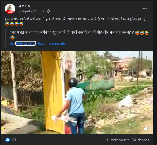 കോവിഡ് രണ്ടാം തരംഗം അതി തീവ്രമാവുകയാണ്.ഓക്സിജൻ ക്ഷാമത്തിന് പരിഹാരമാവാതെ ഉത്തരേന്ത്യൻ സംസ്ഥാനങ്ങൾ നട്ടം തിരിയുന്നു.മതിയായ ഓക്സിജൻ ഇല്ലെന്ന പരാതിയുമായി ഡൽഹിയിലെ ആശുപത്രികൾ വീണ്ടും രംഗത്തെത്തിയിരുന്നു.ഡൽഹിയിൽ ദിനംപ്രതി 976 മെട്രിക് ടൺ ഓക്സിജനാണ് ആവശ്യമാണ് . എന്നാൽ കേന്ദ്രസർക്കാർ അനുവദിച്ചത് 590 മെട്രിക് ടൺ ഓക്സിജൻ മാത്രമാണ്.അനുവദിച്ചതിനെക്കാൾ 100 മെട്രിക് ടൺ കുറവ് ഓക്സിജനാണ് ലഭിച്ചു കൊണ്ടിരിക്കുന്നത് എന്നാണ് ഡൽഹി സർക്കാരിന്റെ വാദം.ഇത്തരം ഭീകരമായ ഒരു സാഹചര്യത്തിലൂടെ രാജ്യം കടന്നു പോവുന്ന ഒരു സന്ദർഭമാണ് ഇത്. അപ്പോഴാണ് ഉത്തരന്ത്യയിൽ ബിജെപി പ്രവർത്തകർ തന്നെ സ്വന്തം പാർട്ടി ഓഫീസ് തല്ലി പൊളിക്കുന്നുവെന്ന തരത്തിലുള്ള ഒരു വീഡിയോ ഫേസ്ബുക്കിൽ വൈറൽ ആവുന്നത്.