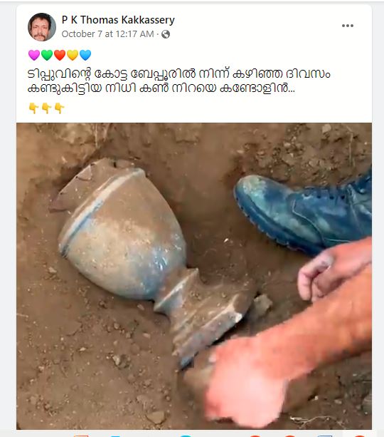 ബേപ്പൂരിലെ ടിപ്പുവിൻ്റെ കോട്ടയിൽ നിന്ന് കഴിഞ്ഞ ദിവസ൦ കണ്ടു കിട്ടിയ നിധി എന്ന പേരിൽ ഒരു ഫോട്ടോ ഫേസ്ബുക്കിൽ വൈറലാവുന്നുണ്ട്.