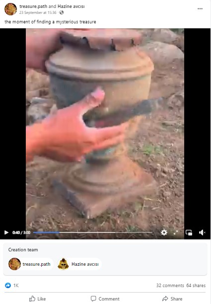 About’ സെക്ഷനിൽ നിന്നും പ്രസക്തമായ വിവരങ്ങളൊന്നും ലഭിക്കാത്തതിനെ തുടർന്ന്, ഞങ്ങൾ പേജിൽ പോസ്റ്റ് ചെയ്ത “നിധി വേട്ട” വീഡിയോകളുടെ പരമ്പരയുടെ ഉള്ളടക്കം പരിശോധിക്കാൻ തുടങ്ങി. “നിഗൂഢമായ ഒരു നിധി കണ്ടെത്തുന്ന നിമിഷം” എന്ന അടിക്കുറിപ്പുള്ള 2022 സെപ്റ്റംബർ 23-ലെ പോസ്റ്റിലേക്ക് ഇത് ഞങ്ങളെ നയിച്ചു. വൈറൽ വീഡിയോയുടെ സ്നിപ്പെറ്റുകൾ പരിശോധിച്ചപ്പോൾ അതിൽ “ക്രിയേഷൻ ടീം” എന്നതിന് താഴെ ‘Hazine avcısı’ and ‘treasure.path’ എന്നിങ്ങനെ എഴുതിയിരിക്കുന്നത് കണ്ടു.