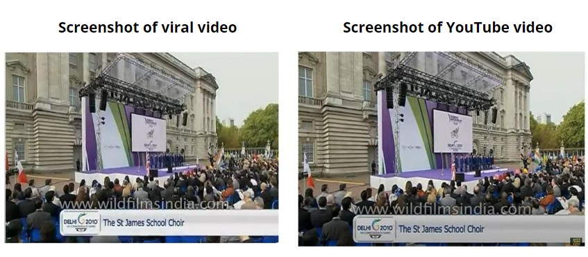 വൈൽഡ് ഫിലിംസ് ഇന്ത്യയും 2019 മെയ് 22-ന് ഇതേ വീഡിയോയുടെ അൽപ്പം ചെറിയ പതിപ്പ് അപ്ലോഡ് ചെയ്തതായി ഞങ്ങൾ കണ്ടെത്തി. അത്തിലെ വിവരണം ഇങ്ങനെ വായിക്കുന്നു, “സെന്റ് ജെയിംസ് സ്കൂൾ ഗായകസംഘം CWGയുടെ ക്വീൻ ബാറ്റൺ 2010 സമയത്ത് ബക്കിംഗ്ഹാം കൊട്ടാരത്തിൽ ശ്ലോകങ്ങൾ എന്ന് വിളിക്കപ്പെടുന്ന ആത്മീയ കവിത ചൊല്ലുന്നു.