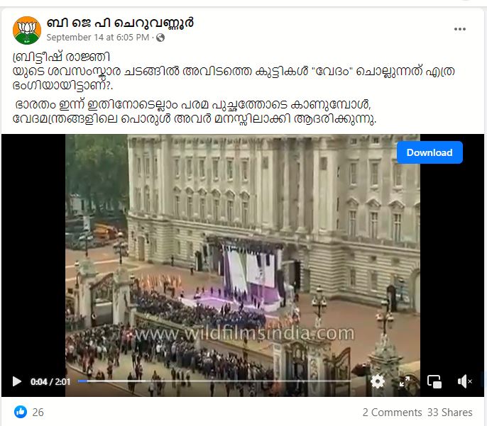 “‘എലിസബത്ത് രാജ്ഞിയുടെ ശവസംസ്കാരത്തിൽ അവിടത്തെ കുട്ടികൾ വേദം ചൊല്ലുന്നത് എത്ര ഭംഗിയായിട്ടാണ്. ഭാരതം ഇന്ന് ഇതിനോടെല്ലാം പരമ പുച്ഛത്തോടെ കാണുമ്പോൾ, വേദമന്ത്രങ്ങളിലെ പൊരുൾ അവർ മനസ്സിലാക്കി ആദരിക്കുന്നു,” എന്ന് അവകാശപ്പെടുന്ന വീഡിയോ വൈറലാവുന്നുണ്ട്.