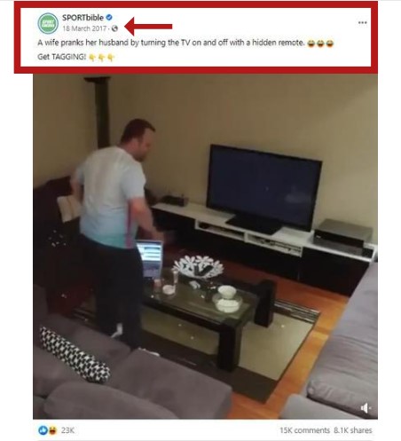 വൈറൽ വീഡിയോയുടെ കീഫ്രെയിമുകളിൽ ഞങ്ങൾ Google റിവേഴ്സ് ഇമേജ് സേർച്ച് നടത്തി. അത് 2017 മാർച്ച് 18-ന് SPORTbible-ന്റെ വെരിഫൈഡ് അക്കൗണ്ടിൽ ഫേസ്ബുക്ക് പോസ്റ്റിലേക്ക് ഞങ്ങളെ നയിച്ചു. “ഫുട്ബോൾ മത്സരം കാണുന്നതിനിടയിൽ മറച്ചുവെച്ച റിമോട്ട് ഉപയോഗിച്ച് ടിവി ഓണും ഓഫും ആക്കി ഒരു ഭാര്യ ഭർത്താവിനെ കളിയാക്കുന്നു. ടാഗിംഗ് നേടൂ!” എന്നാണ് പോസ്റ്റ് പറയുന്നത്.