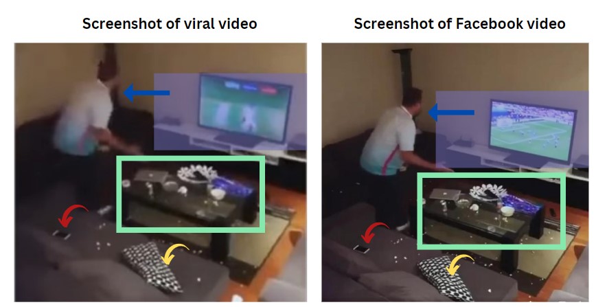 ഫേസ്ബുക്ക് വീഡിയോയുടെ കീഫ്രെയിമുകളും വൈറൽ ക്ലിപ്പിന്റെ ഫ്രെയിമുകളും താരതമ്യം ചെയ്തപ്പോൾ , രണ്ട് ഫൂട്ടേജുകളും ഒരേ സംഭവവുമായി ബന്ധപ്പെട്ടതാണെന്ന് നിഗമനത്തിൽ ഞങ്ങൾ എത്തി. വൈറൽ ക്ലിപ്പിൽ ഒരു ക്രിക്കറ്റ് മത്സരം ടിവി സ്ക്രീനിൽ സംപ്രേeക്ഷണം ചെയ്യുന്നത് കാണാം. അതേസമയം ഫേസ്ബുക്ക് വീഡിയോ ഒരു സോക്കർ ഗെയിമിന്റെ ദൃശ്യങ്ങൾ കാണിക്കുന്നു.