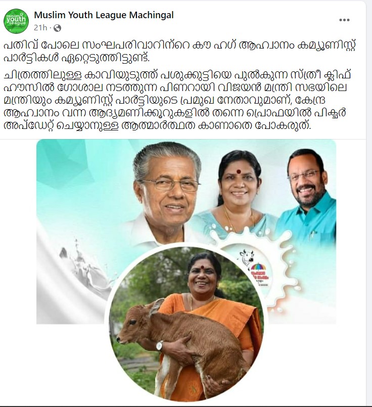 “കേന്ദ്രം ഫെബ്രുവരി 14 ന് “കൗ ഹഗ് ഡേ” ആഘോഷിക്കാൻ പറഞ്ഞു. പറഞ്ഞു മണിക്കൂറുകൾക്കുള്ളിൽ നടപ്പിലാക്കി സഖാവ്,” എന്ന വിവരണത്തോടെയാണ് പോസ്റ്റ് ഷെയർ ചെയ്യപ്പെടുന്നത്. കൊണ്ടോട്ടി പച്ചപട എന്ന ഐഡിയിൽ നിന്നും ഞങ്ങൾ കാണും വരെ 88 പേർ പോസ്റ്റ് ഷെയർ ചെയ്തിട്ടുണ്ട്.