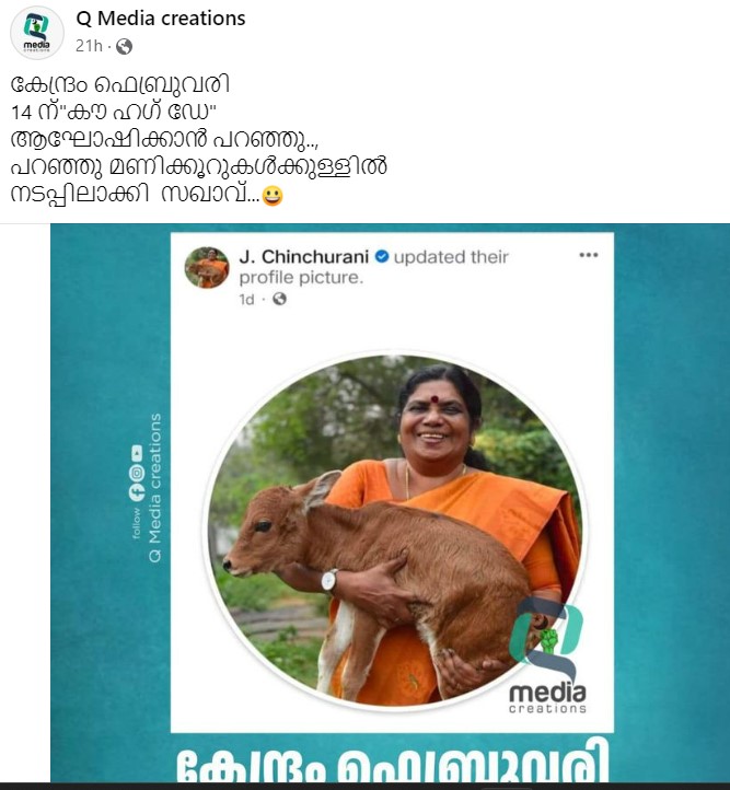 ഫെബ്രുവരി 14 ന് “കൗ ഹഗ് ഡേ” ആയി കേന്ദ്ര മൃഗ സംരക്ഷണ ബോർഡ് ആഘോഷിക്കാൻ തീരുമാനിച്ച പശ്ചാത്തലത്തിൽ, മൃഗസംരക്ഷണ-ക്ഷീര വികസന മന്ത്രി ജെ ചിഞ്ചുറാണി കാവി സാരി ഉടുത്ത് പശുക്കിടാവിനെ ഉയർത്തി നിൽക്കുന്ന പടം തന്റെ ഫേസ്ബുക്കിലെ പ്രൊഫൈൽ പടമായിട്ടിരിക്കുന്നത് വ്യാപകമായി ഷെയർ ചെയ്യപ്പെടുകയാണ്. കേന്ദ്ര മൃഗ സംരക്ഷണ ബോർഡിന്റെ തീരുമാനത്തിന് ഐക്യദാർഢ്യമായാണ് ഈ ഫോട്ടോയിട്ടിരിക്കുന്നത് എന്നാണ് അവകാശവാദം. ഭരണ മുന്നണിയിലെ രണ്ടാമത്തെ വലിയ കക്ഷിയായ സിപിഐയുടെ നേതാവാണ് ചിഞ്ചുറാണി. വാലന്റൈൻസ് ഡേ ആയ ഫെബ്രുവരി 14ന് ‘കൗ ഹഗ് ഡേ’യായി ആചരിക്കാനുള്ള തീരുമാനത്തിൽ നിന്നും പിന്നീട് കേന്ദ്ര മൃഗക്ഷേമ ബോർഡ് പിന്മാറി.