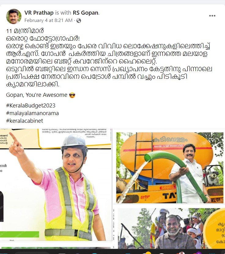 തുടർന്നുള്ള അന്വേഷണത്തിൽ മനോരമ ഫോട്ടോഗ്രാഫർ ആർ എസ് ഗോപൻ വിവിധ മന്ത്രിമാരുടെ ചിത്രം മലയാള മനോരമയിലെ ബജറ്റ് കവറേജിന്റെ ഭാഗമായി പകർത്തിയതിൽ നിന്നുമുള്ളതാണ് ഈ ഫോട്ടോ എന്ന് വ്യക്തമാക്കി മനോരമ ലേഖകൻ VR Prathap ഫെബ്രുവരി 4,2023ൽ കൊടുത്ത ഫേസ്ബുക്ക് പോസ്റ്റും ഞങ്ങൾക്ക് കിട്ടി.