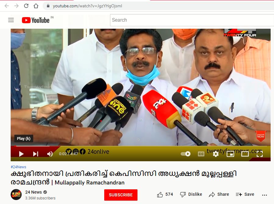 വൈറൽ വീഡിയോയിലെ അതെ വാക്കുകൾ മുല്ലപ്പള്ളി പറയുന്നത് മനോരമ ന്യൂസും 24 ന്യൂസും കൊടുത്ത ന്യൂസ് റിപ്പോർട്ടുകളുടെ വീഡിയോകളിൽ വ്യക്തമായി കേൾക്കാം. രണ്ടു വീഡിയോകളിലും മുല്ലപ്പള്ളി മാധ്യമങ്ങളോട് ചൂടാവുന്നത് കാണാം.