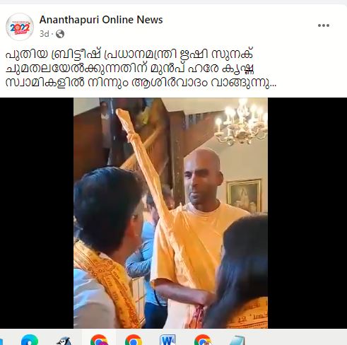 ഋഷി സുനക് പുതിയ ബ്രിട്ടീഷ് പ്രധാനമന്ത്രിയായി ചുമതലയേൽക്കുന്നതിന് മുൻപ് ഹരേ കൃഷ്ണ സ്വാമികളിൽ നിന്നും ആശിർവാദം വാങ്ങുന്നുവെന്ന പേരിൽ ഒരു വീഡിയോ ഫേസ്ബുക്കിൽ വൈറലാവുന്നുണ്ട്.
