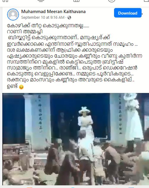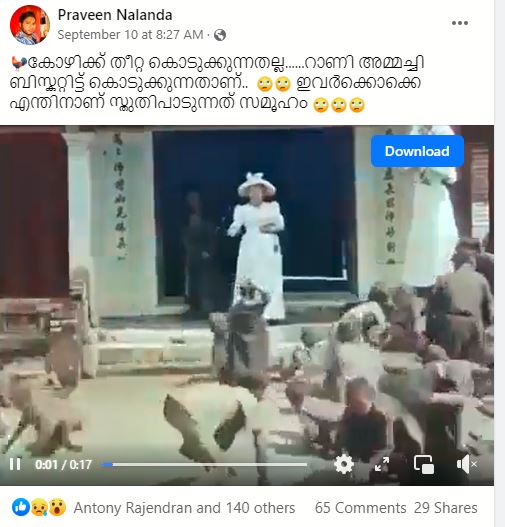 ”കോഴിക്ക് തീറ്റ കൊടുക്കുന്നതല്ല.റാണി അമ്മച്ചി ബിസ്കറ്റിട്ട് കൊടുക്കുന്നതാണ്. മനുഷ്യർക്ക്. ഇവർക്കൊക്കെ എന്തിനാണ് സ്തുതിപാടുന്നത് സമൂഹം. ദശലക്ഷകണക്കിന് ആഫ്രിക്കക്കാരുടെയും ഏഷ്യക്കാരുടെയും ചോരയും കണ്ണീരും വീണു കുതിർന്ന സമ്പത്തിന്റെ മുകളിൽ കെട്ടിപെടുത്ത ബ്രിട്ടീഷ് സാമ്രാജ്യത്തിന്റെ രാ. ഒരുപാട് ഡെക്കറേഷൻ കൊടുത്തു വെളുപ്പിക്കേണ്ട. നമ്മുടെ പൂർവികരുടെ രക്തവും മാംസവും കണ്ണീരും അവരുടെ കെെകളിൽ ഉണ്ട്,” എന്നാണ് വീഡിയോയ്ക്ക് ഒപ്പമുള്ള വിവരണം പറയുന്നത്.