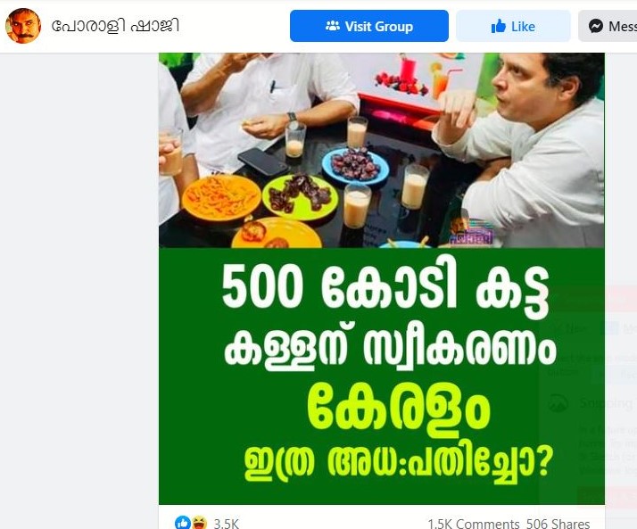 രാഹുൽ ഗാന്ധിയെ ഇ ഡി ചോദ്യം ചെയ്തതും അദ്ദേഹത്തിന്റെ സമീപ കാലത്തെ വയനാട് സന്ദർശനവും കൂടി ചേർത്ത് ഒരു ഫോട്ടോ വൈറലാവുന്നുണ്ട്. അദ്ദേഹവും കെസി വേണുഗോപാലും ഒരു ചായക്കടയിൽ ചായയും പലഹാരങ്ങളും കഴിക്കുന്ന ദൃശ്യങ്ങളാണ് ഇത്.”സ്വന്തം മണ്ഡലത്തിൽ വന്ന് ബോണ്ടയും തിന്ന് പോകാൻ 500 കോടി കട്ട് 60 മണിക്കൂർ അന്വേഷണ ഏജൻസികൾ ചോദ്യം ചെയ്ത പട്ടായ പയ്യന് സ്വീകരണമോ ?,” എന്നാണ് ഫോട്ടോയോടൊപ്പം ഉള്ള വിവരണം പറയുന്നത്.