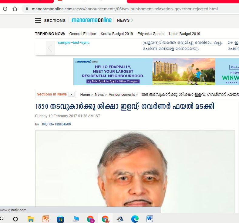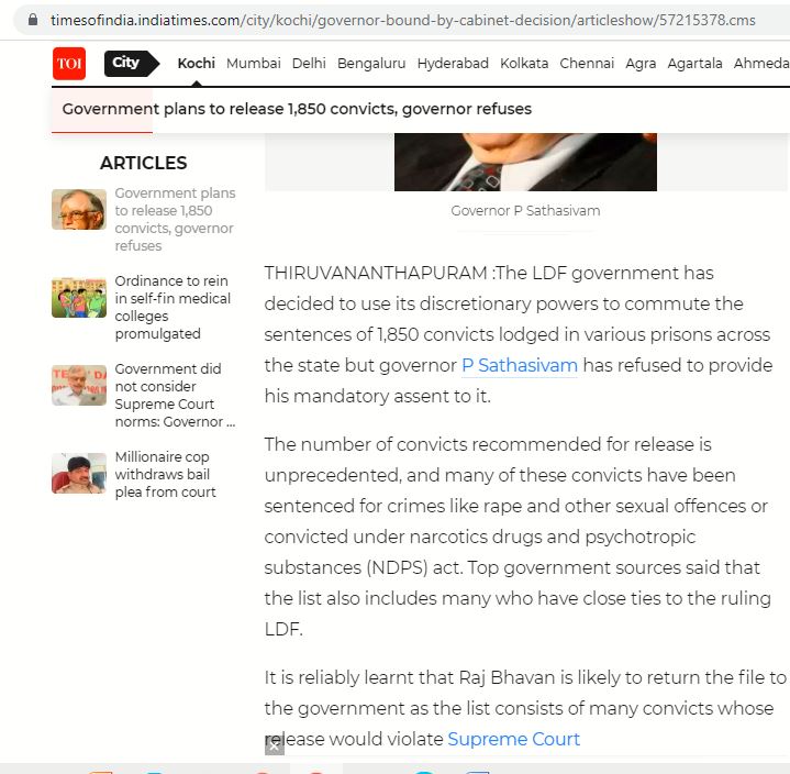 Government plans to release 1,850 convicts, governor refuses എന്നാണല്ലോ പ്രചരിക്കുന്ന വാർത്തയുടെ തലേക്കെട്ട്. അത് ഗൂഗിൾ സേർച്ച് ചെയ്തപ്പോൾ ടൈംസ് ഓഫ് ഇന്ത്യയുടെ 2017 ഫെബ്രുവരി 18ലെ വാർത്ത കിട്ടി.