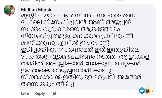 വാവർ ഒരു കടൽ കൊള്ളക്കാരനായിരുന്നുവെന്നാണ് ഐതിഹ്യം. കടൽ കൊള്ളക്കാരുടെ കപ്പലിൽ വാവർ കേരളത്തിലെത്തിയത് കൊള്ളയടിക്കാനാണെന്നും ഐതിഹ്യം പറയുന്നു. അയ്യപ്പൻ വാവരോട് യുദ്ധം ചെയ്തു വിജയിച്ചു. യുവാവിന്റെ കഴിവിൽ അത്ഭുതപ്പെട്ടു പോയ അദ്ദേഹം അയ്യപ്പനോടൊപ്പം ചേർന്ന് വിവിധ മുന്നണികളിൽ യുദ്ധങ്ങൾ ജയിക്കാൻ സഹായിച്ചു. രാജാവിന്റെ സ്വപ്നത്തിൽ അയ്യപ്പൻ പ്രത്യക്ഷപ്പെടുകയും വാവർക്ക് പള്ളി പണിയാൻ നിർദ്ദേശം നൽകുകയും ചെയ്തുവെന്നാണ് വിശ്വാസം. അത് കൊണ്ട് തന്നെ നിരവധി അയ്യപ്പ ഭക്തർ വാവർ പള്ളിയിൽ സംഭാവന നൽകാറുണ്ട്. ഈ പശ്ചാത്തലത്തിൽ ഇങ്ങനെ സംഭാവന നൽകുന്നവരെ പിന്തിരിപ്പിക്കുക എന്ന ഉദേശമാണ് പോസ്റ്റിന്.