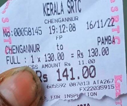 ഞങ്ങൾ രണ്ട് ടിക്കറുകളും പരിശോധിച്ചു. ആദ്യ ടിക്കറ്റ് കെ എസ്ആര്ടിസി ചെങ്ങന്നൂര് ഡിപ്പോയിലേതാണ്. രണ്ടാമത്തത് മറ്റൊന്ന് കോട്ടയം ഡിപ്പോയിലേതും. രണ്ടും ഫാസ്റ്റ് പാസഞ്ചര്(FP) സര്വീസുകളുടെ ടിക്കറ്റ്. ഒന്ന് ചെങ്ങന്നൂരില് നിന്ന് പമ്പയിലേക്ക് പോയ ടിക്കറ്റ്. മറ്റേത്,പമ്പയില് നിന്ന് ചെങ്ങന്നൂരിലേക്ക് പോയത്. പമ്പയിലേക്കുള്ള ടിക്കറ്റിംന്റെ ചാർജ്ജ് സര്വീസില് സെസ് ചാര്ജ് 11 രൂപ ഉള്പ്പെടെ 141 രൂപയാണ്. തിരിച്ചുള്ള ടിക്കറ്റിന് 180 രൂപയാണ് കാണിക്കുന്നത്.