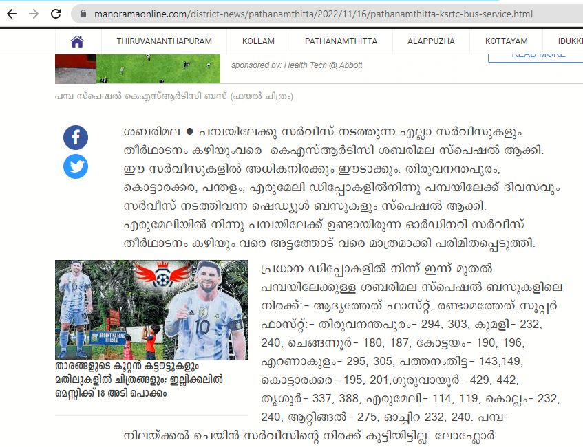 തുടർന്ന് ഞങ്ങൾ മണ്ഡലകാലത്ത് ശബരിമലയിലേക്ക് ടിക്കറ്റ് നിരക്കിൽ മാറ്റം ഉണ്ടോ എന്നറിയാൻ കീ വേർഡ് സേർച്ച് നടത്തി. അപ്പോൾ മനോരമ ഓൺലൈൻ നവംബർ 16,2022 ന് കൊടുത്ത വാർത്ത കിട്ടി.