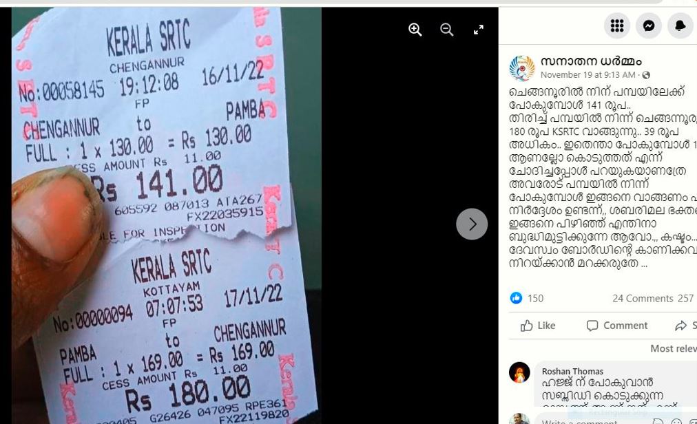 ”ചെങ്ങന്നൂരിൽ നിന്ന് പമ്പയിലേക്ക് പോകുമ്പോൾ 141 രൂപ. തിരിച്ച് പമ്പയിൽ നിന്ന് ചെങ്ങന്നൂരുക്ക് 180 രൂപ KSRTC വാങ്ങുന്നു. 39 രൂപ അധികം. ഇതെന്താ പോകുമ്പോൾ 141 ആണല്ലോ കൊടുത്തത് എന്ന് ചോദിച്ചപ്പോൾ പറയുകയാണത്രേ അവരോട് പമ്പയിൽ നിന്ന് പോകുമ്പോൾ ഇങ്ങനെ വാങ്ങണം എന്ന നിർദ്ദേശം ഉണ്ടന്ന്,” എന്നാണ് പോസ്റ്റുകൾ അവകാശപ്പെടുന്നത്. ശബരിമലയിലെ മണ്ഡലകാലം ആരംഭിച്ചത് മുതലാണ് ഈ പ്രചരണം നടക്കുന്നത്. വൃശ്ചികം ഒന്നായ നവംബർ 17 മുതൽ ഡിസംബർ 27 വരെയാണ് മണ്ഡലകാലം.