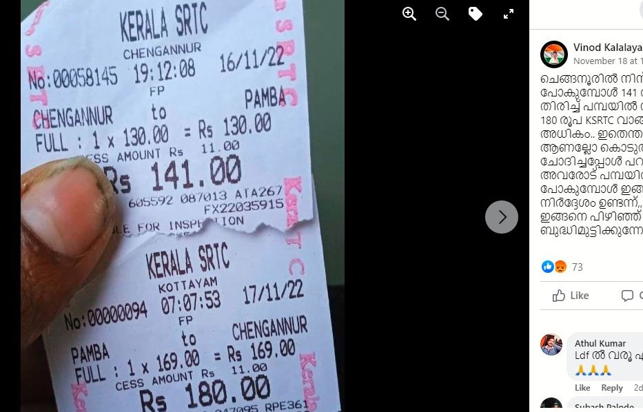 ചെങ്ങന്നൂരിൽ നിന്ന് പമ്പയിലേക്ക് പോകുമ്പോൾ ഉള്ളതിനേക്കാൾ 39 രൂപ അധികം കെഎസ്ആർടിസി ഈടാക്കുന്നു എന്ന പേരിൽ ഒരു പോസ്റ്റ് വൈറലാവുന്നുണ്ട്.