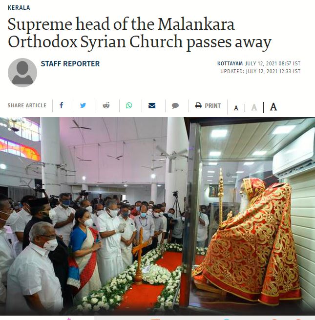 2021 ജൂലൈ 12 ന് ബസേലിയോസ് മാർത്തോമാ പൗലോസ് ദ്വിതീയൻ കാതോലിക്കാ ബാവയുടെ നിര്യാണത്തെ കുറിച്ചുള്ള ദി ഹിന്ദു വർത്തയ്ക്കൊപ്പം പിണറായിയും വീണ ജോർജ്ജും അദ്ദേഹത്തിന് അന്ത്യാഞ്ജലി അർപ്പിക്കുന്ന പടം കണ്ടെത്തി.