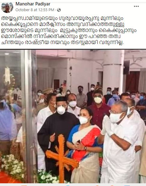 ”അയ്യപ്പസ്വാമിയുടെയും ഗുരുവായൂരപ്പന്റെയും മുന്നിലും കൈകൂപ്പാനെ മാർക്സിസം അനുവദിക്കാത്തതുള്ളു. ഈശോയുടെ മുന്നിൽ മുട്ടുകുത്താനും കൈകൂപ്പാനും മോസ്ക്കിൽ നിസ്ക്കരിക്കാനും ഈ പറഞ്ഞ തത്വചിന്തയും രാഷ്ട്രീയ നയവും തടസ്സമായി വരുന്നില്ല,” എന്നവകാശപ്പെടുന്ന പോസ്റ്റ് മുഖ്യമന്ത്രി പിണറായി വിജയനും ആരോഗ്യ മന്ത്രി വീണ ജോർജ്ജും ഒരു കുരിശിനെ വണങ്ങുന്നുവെന്ന് തോന്നിപ്പിക്കുന്ന ചിത്രത്തിനൊപ്പമാണ് പോസ്റ്റ്.