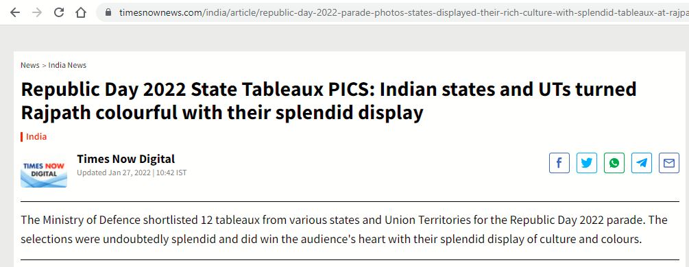 ഞങ്ങൾ ആദ്യം ഈ വർഷത്തെ റിപ്പബ്ലിക്ക് ദിന പരേഡിലെ നിശ്ചല ദൃശ്യങ്ങൾ ഏതൊക്കെയെന്ന് പരിശോധിച്ചു, ടൈംസ് നൗവിന്റെ റിപ്പോർട്ട് പ്രകാരം 12 നിശ്ചല ദൃശ്യങ്ങളായിരുന്നു ഈ കൊല്ലം പരേഡിന് ഉണ്ടായിരുന്നത്.