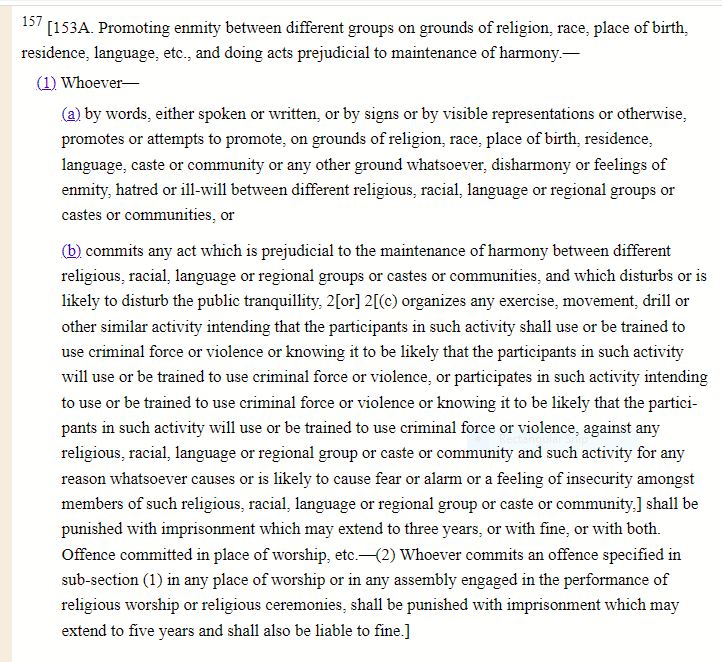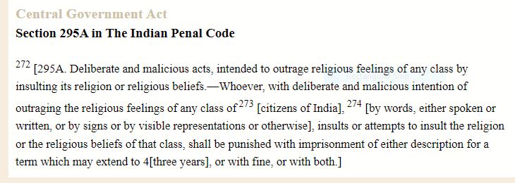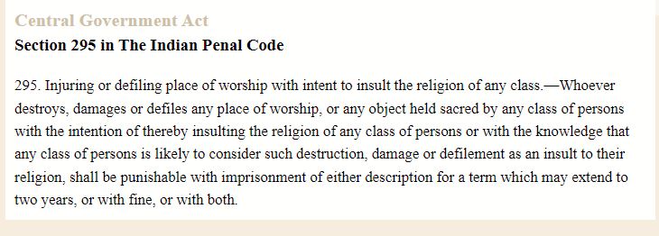 മതവിഭാഗങ്ങൾക്കെതിരായ ആക്രമണം കൈകാര്യം ചെയ്യുന്ന ഐപിസി വകുപ്പുകൾ, യഥാക്രമം 295, 295A, 153A എന്നിവയാണ്. ‘ഇന്ത്യാ കാനുൺ’ എന്ന വെബ്സൈറ്റിലെ വിവരണം അനുസരിച്ച് ഈ വകുപ്പുകൾ പ്രകാരം ലഭിക്കാവുന്ന പരമാവധി ശിക്ഷ യഥാക്രമം 2 വർഷം, 3 വർഷം, 5 വർഷം തടവ് ആണ്.