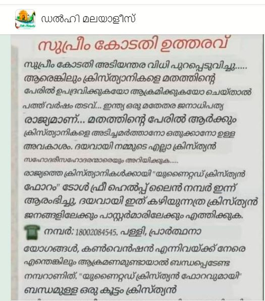 ഈ ഒരു പശ്ചാത്തലത്തിലാവണം, “ക്രിസ്ത്യാനികളെ അക്രമിക്കുന്നതിനെതിരെ സുപ്രീം കോടതി ഒരു ഉത്തരവ് ഇറക്കിയിട്ടുണ്ട്” എന്ന രീതിയിലുള്ള പ്രചരണം ഫേസ്ബുക്കിൽ നടക്കുന്നത്.