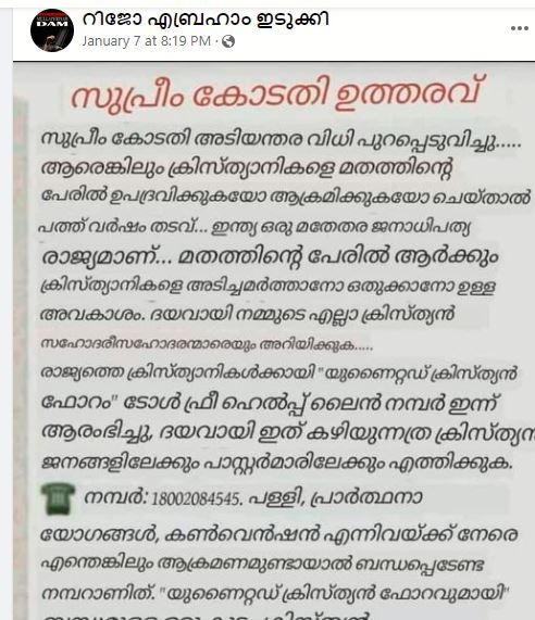 “ഇത്തരം അക്രമങ്ങൾ ശ്രദ്ധയിൽ വന്നാൽ 18002084545 എന്ന യുണൈറ്റഡ് ക്രിസ്ത്യൻ ഫോറത്തിന്റെ ഹെൽപ്പ്ലൈൻ നമ്പറിൽ ബന്ധപ്പെടണം,” എന്ന് ആവശ്യപ്പെട്ടു കൊണ്ടാണ് ഈ പോസ്റ്റ് വൈറലാവുന്നത്.
