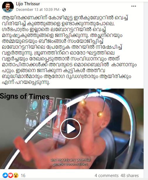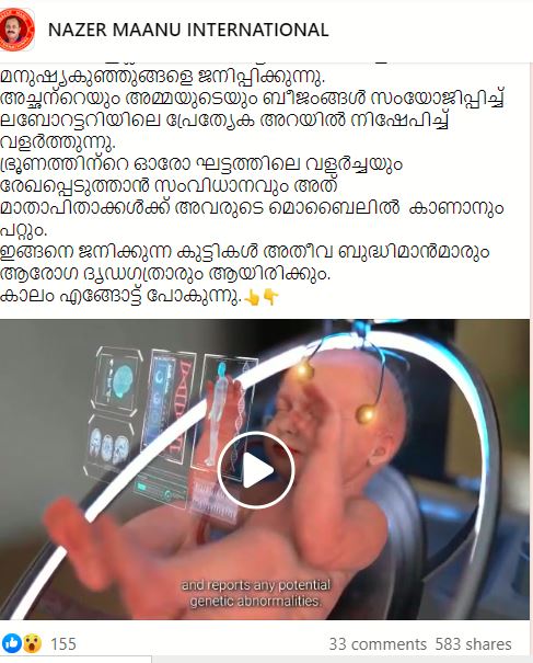 “ആയിരക്കണക്കിന് കോഴിമുട്ട ഇൻകുബേറ്ററിൽ വെച്ച് വിരിയിച്ച് കുഞ്ഞുങ്ങളെ ഉണ്ടാക്കുന്നതുപോലെ, ഗർഭപാത്രം ഇല്ലാതെ ലബോറട്ടറിയിൽ വെച്ച് മനുഷ്യകുഞ്ഞുങ്ങളെ ജനിപ്പിക്കുന്നു. അച്ഛന്റെയും അമ്മയുടെയും ബീജംങ്ങൾ സംയോജിപ്പിച്ച് ലബോറട്ടറിയിലെ പ്രേത്യേക അറയിൽ നിക്ഷേപിച്ച് വളർത്തുന്നു. ഭ്രൂണത്തിന്റെ ഓരോ ഘട്ടത്തിലെ വളർച്ചയും രേഖപ്പെടുത്താൻ സംവിധാനവും അത് മാതാപിതാക്കൾക്ക് അവരുടെ മൊബൈലിൽ കാണാനും പറ്റും. ഇങ്ങനെ ജനിക്കുന്ന കുട്ടികൾ അതീവ ബുദ്ധിമാൻമാരും ദൃഢ ഗാത്രരും ആയിരിക്കും എന്ന് പറയപ്പെടുന്നു,” എന്നാണ് വീഡിയോയ്ക്കൊപ്പമുള്ള കുറിപ്പ് പറയുന്നത്.
