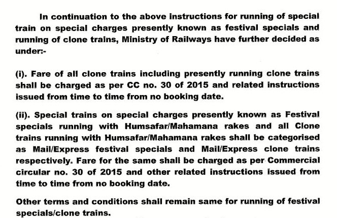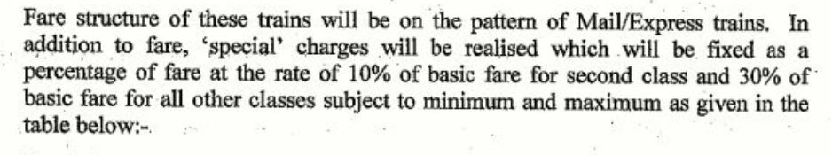 തുടർന്നുള്ള പരിശോധനയിൽ, ഫെയര് സ്റ്റേജ് കണക്കാക്കുന്ന രീതി വിശദമാക്കുന്ന മെയ് 21, 2015ലെ ഉത്തരവ് കിട്ടി. മെയില്/എക്സ്പ്രസ് ട്രെയിനുകളുടെ പാറ്റേണിലാണ് സ്പെഷ്യല് ട്രെയിനുകള്ക്ക് ചാര്ജ് നിശ്ചയിക്കുന്നത്. സെക്കൻഡ് ക്ളാസ് ടിക്കറ്റുകള്ക്ക് 10% അധികം നിരക്ക് ഈടാക്കും. മറ്റ് ക്ലാസുകളില് 30% അധികം ഈടാക്കും.