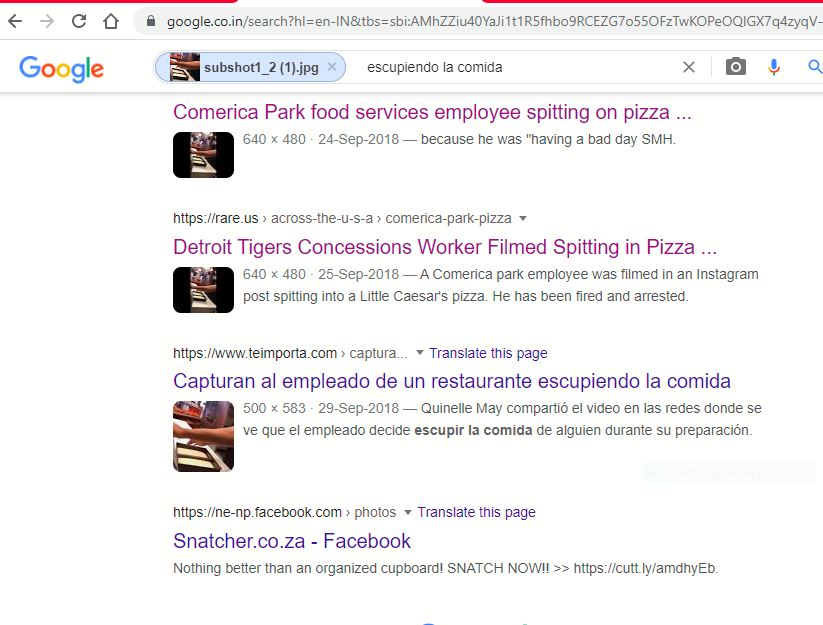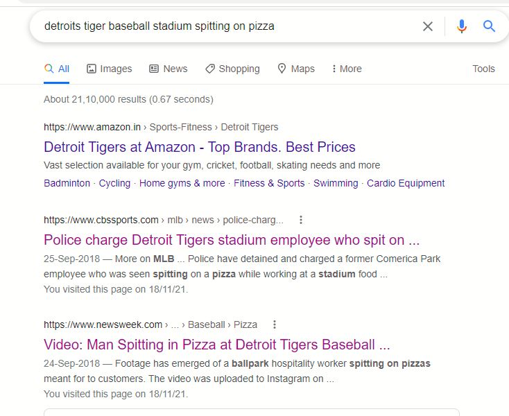 തുടർന്ന് ഞങ്ങൾ detroits tiger baseball stadium spitting on pizza എന്ന് കീ വേർഡ് സേർച്ച് ചെയ്തു.Cbssports.Newsweek,ESPN തുടങ്ങി ധാരാളം ഇംഗ്ലീഷ് വെബ്സൈറ്റുകൾ ഈ വാർത്ത അമേരിക്കയിലെ ഡെട്രോയിറ്റ് ടൈഗേഴ്സ് ബേസ്ബോൾ സ്റ്റേഡിയത്തിൽ നിന്ന് പകർത്തിയ ഒരു വീഡിയോ എന്ന പേരിൽ പങ്ക് വെച്ചിട്ടുണ്ട്.