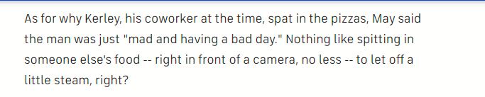 “പിസയിൽ തുപ്പുന്ന വീഡിയോ പുറത്തുവന്നതിനെ തുടർന്ന് ഡിട്രോയിറ്റ് ടൈഗേഴ്സിന്റെ ഹോം സ്റ്റേഡിയത്തിലെ ഭക്ഷണ വിതരണ ജോലിയിൽ നിന്ന് പിരിച്ചുവിട്ട യുവാവ് കുറ്റം സമ്മതിച്ചു.നാലു മാസം വരെ ശിക്ഷകിട്ടാവുന്ന കുറ്റമാണ് അയാൾ ചെയ്തത്,”എന്ന്, ESPN റിപ്പോർട്ട് ചെയ്യുന്നു.
