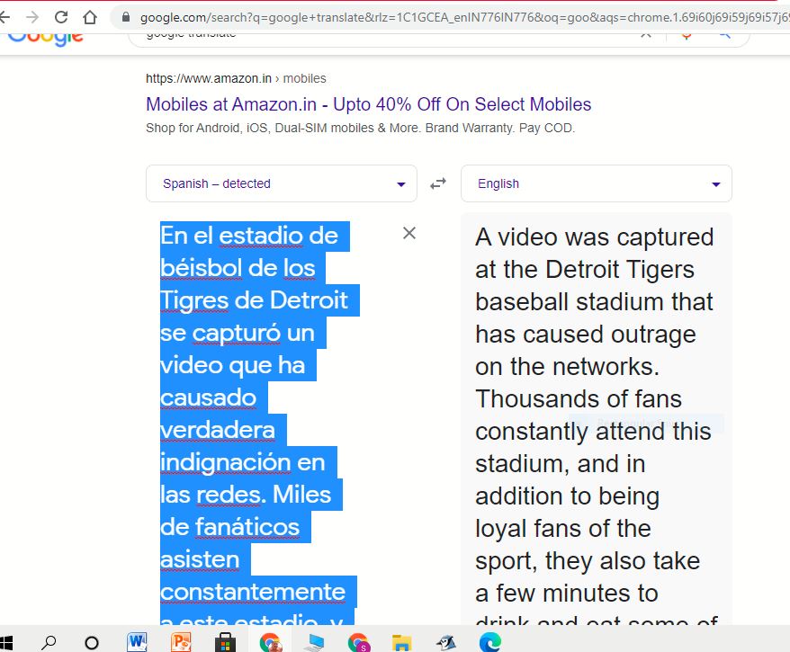 വിവർത്തനം ചെയ്ത ഭാഗം പറയുന്നത് ഇങ്ങനെയാണ്: “ഡെട്രോയിറ്റ് ടൈഗേഴ്സ് ബേസ്ബോൾ സ്റ്റേഡിയത്തിൽ നിന്ന് പകർത്തിയ ഒരു വീഡിയോ സാമൂഹ്യ മാധ്യമ നെറ്റ്വർക്കുകളിൽ പ്രകോപനം സൃഷ്ടിച്ചു. ആയിരക്കണക്കിന് ആരാധകർ ഈ സ്റ്റേഡിയത്തിൽ സ്ഥിരമായി കളികൾ കാണാൻ എത്തുന്നു. സ്റ്റേഡിയത്തിലെ ഫുഡ് സ്റ്റാൻഡിലെ വാഗ്ദാനം ചെഭക്ഷണവും പാനീയങ്ങളും കുടിക്കാനും കഴിക്കാനും അവർ സമയം കണ്ടെത്തുന്നു.”