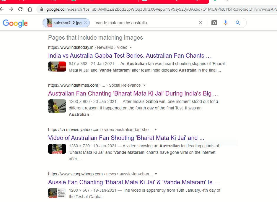 തുടർന്നുള്ള തിരച്ചിലിൽ ഇന്ത്യാ ടുഡേയുടെ യൂട്യൂബ് ചാനലിന്റെ ഒരു വീഡിയോ റിപ്പോർട്ട് കണ്ടെത്തി. ആ വീഡിയോ റിപ്പോർട്ട് അനുസരിച്ച്, ഇത് ജനുവരി 19,2020 ന് ഓസ്ട്രേലിയയും ഇന്ത്യയും തമ്മിലുള്ള നാലാമത്തെയും അവസാനത്തെയും ടെസ്റ്റ് മത്സരത്തിൽ ഇന്ത്യ വിജയിച്ചതിനു ശേഷമുള്ള വീഡിയോയാണ്. ഇതാണ് പാകിസ്താനെ T20 സെമിയിൽ തോൽപിച്ച ഓസ്ട്രേലിൻ ടീം വന്ദേ മാതരം വിളിക്കുന്നു എന്ന അവകാശവാദത്തോടെ, വൈറലാകുന്നത്. ഈ വിജയത്തോടെ ബോർഡർ-ഗവാസ്കർ ട്രോഫി ഇന്ത്യ 2-1ന് സ്വന്തമാക്കി.