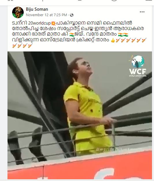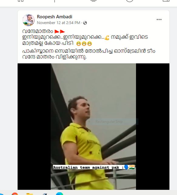T20 സെമിയിൽ പാകിസ്താനെ തോൽപിച്ച ഓസ്ട്രേലിയൻ ടീം വന്ദേ മാതരം വിളിക്കുന്നു എന്ന് അവകാശപ്പെടുന്ന ഒരു വീഡിയോ ഫേസ്ബുക്കിൽ വൈറലാവുന്നുണ്ട്.